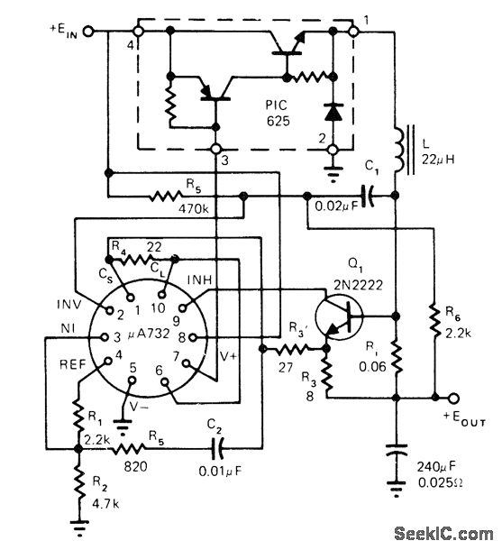 Positive switching regulator circuit uses, μA732 with Unitrode PIC625 hybrid power switch and single transistor, operating in fixed OFF-time mode. Article covers regulator theory of operation in detail.-L. Dixon and ft. Patel, Designers' Guide to: Switching Regulators, EDN Magazine, Oct, 20, 1974, p 53-59.