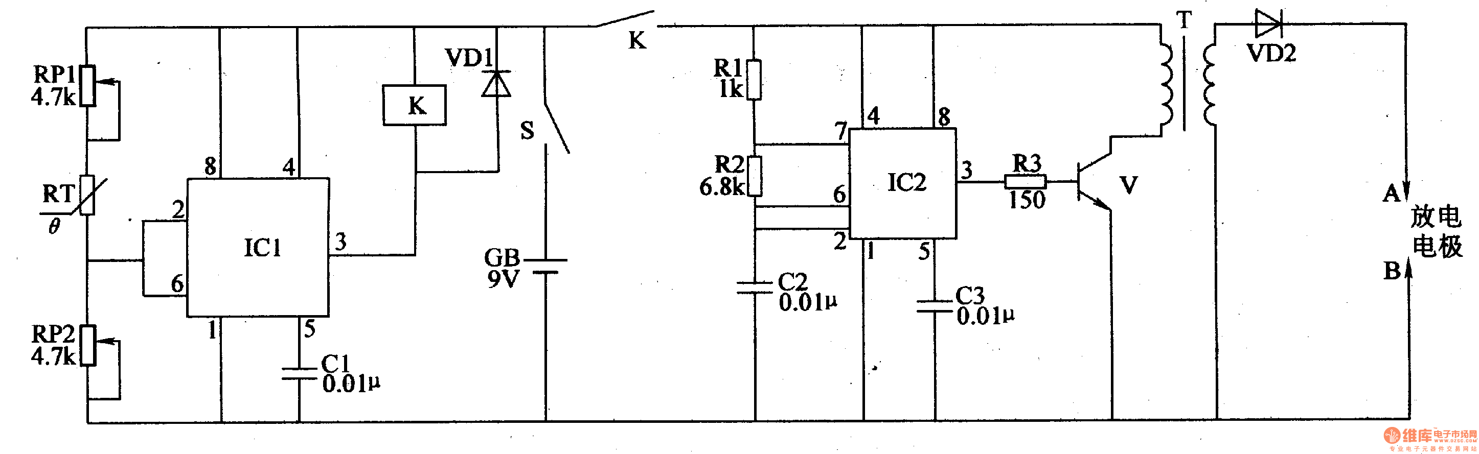 The principle of circuitThe crops automatic frost prevention controller circuitis formed by the temperature detection control circuit and high-voltage ignition circuit, which is shown in figure 4-107. Temperature detection control circuit is formed by the time-base integrated circuit IC1,potentiometers RP1,RP2,diode VD1, relay K and capacitor C1. High-voltage ignition circuit is formed by the time-base integrated circuit IC2, resistors R1-R3, capacitors C2,C3,transistor V, high-voltage transformer T,high-voltage rectifier diode VD2 and discharge electrodes A,B.