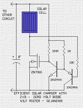The Zero Volt Diode -- a synchronous rectifier circuit by Wilf Rigter: The Zero Volt Diode (ZVD) is a circuit useful in a variety of applications including solar chargers of all types. It is a novel circuit in which a power MOSFET acts like a very low voltage drop diode that switches state at 0V and which is used to conduct negative current from drain to source. In D1 type solar engines, a low loss diode can be used to charge a cap to the open circuit voltage of the solar cell and used in solar battery chargers, the battery is charged at the maximum rate when the source voltage is highest. The diode must be used in series with the solar panel or else the cap or battery would discharge through the solar panel when the panel voltage drops below the stored voltage. The diode or equivalent polarity sensitive switch is therefore essential to solar chargers. Most diodes used in BEAM SEs and solar chargers are Silicon diodes like the 1N4001 which have a voltage drop of 0.6V to 1V at currents up to 1A. More efficient diodes for currents form >100mA to tens of amps applications are the Schottky type rectifiers with a voltage drop of from 200mV to 1000mV depending on the current level. For <100mA applications a Germanium diode can used with 200mV or less drop. This voltage drop issue is important in competition solar engines since you would like to have the maximum voltage to charge the cap and supply the load (low diode drop) and keep the charge stored on the cap when the lightlevel drops (leakage current cut off) and the SE triggers. Moreover, since the energy in the cap is proportional to the square of the voltage even the small voltage drop of a diode reduces available energy. One obvious simple improvement over the original D1 design is to substitute a Ge 1N34A diode (Radio Shack) instead of the Si 1N4001 diode. An ideal diode would have zero voltage drop. While a straight hookup of the solar cell has minimum voltage drop it leaks if the light drops and any real diode has a forward voltage drop. What to do? The solution is to use a MOSFET as a rectifier just like the synchronous rectifier applications in voltage converters. The MOSFET should be switched ON when the solar voltage is larger than the capacitor or battery voltage and switch OFF when the solar voltage is lower than the stored voltage. Here is a little design for charging capacitors from solar cells with zero voltage drop at the end of the charge cycle. It can be easily scaled to higher currents by changing the 2N7000 for a larger MOSFET. If a parallel load is present, the circuit also delivers maximum voltage with minimum insertion loss from the solar cell. The MOSFET turns on when the voltage difference is zero and turns off when the solar voltage drops less than 100mV below the cap or battery. The NPN transistor is normally ON when the cap voltage is more than .6V and this clamps the gate of the 2N7000 which is turned OFF. The PNP transistor is connected to the negative terminal of the solar panel and when the voltage on that terminal drops below 0V the PNP turns ON. This in turn turns the NPN OFF and the 2N7000 turns ON. MOSFETs have an interesting characteristic in that they act like bi-directional switches, so the 2N7000 is perfectly happy to have it's drain conduct a negative current to the 0V line. When the voltage on the negative terminal of the solar panel is more positive than 0V the PNP turns OFF and the NPN ON and the 2N7000 turns off with the drain voltage positive with respect to the source voltage and 0V line. Since the 2N7000 does not turn on until the gate voltage is more than 2V (in practice: higher according to the data book) a logic FET with a lower gate turn on voltage would be preferred. In any case the MOSFET has a integral reverse diode from drain to source which will carry the current until the voltage on the cap reaches 2V at which point the MOSFET turns on and the forward voltage drops to a few 10s of mV.   (View)