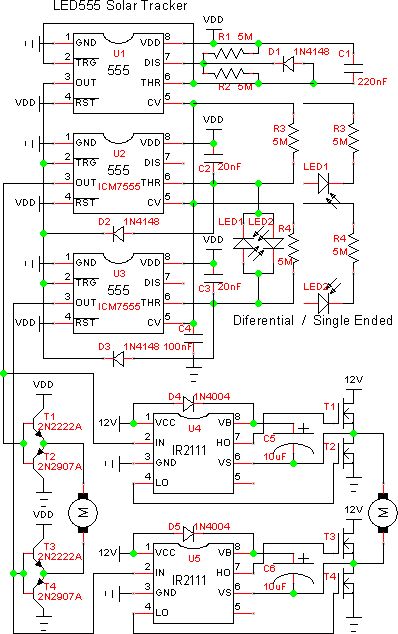 I was looking for a much lower cost tracker for low power applications. One of these applications is a small lighting heliostat. This circuit uses small switching transistors. The maximum motor drive current is limited to about 250mA maximum at 5V. I've tested the circuit on voltages from 3V to 21V. With some component changes it should be useful to 63V in a 36V PV panel system although I haven't tried this yet. With higher voltage and the use of heat sinks on the bridge transistors much higher currents should be possible.   (View)