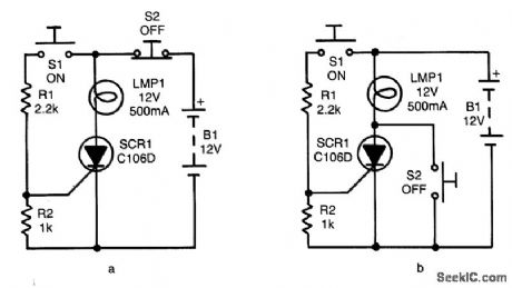 In both circuits, the SCR (and thereby the lamp) can be latched on by momentarily closing S1, thereby feeding gate drive to the SC via R1. In both circuits, the gate is tied to the cathode via R2 to improve circuit stability.Of course, after the SCR turns on, it can be tumed off again only by momentarily reducing anode current below the device's IH value. The SCR is tumed off by momentarily opening S2, by using S2 to short the anode and cathode terminals of the SCR momentarily. (View)