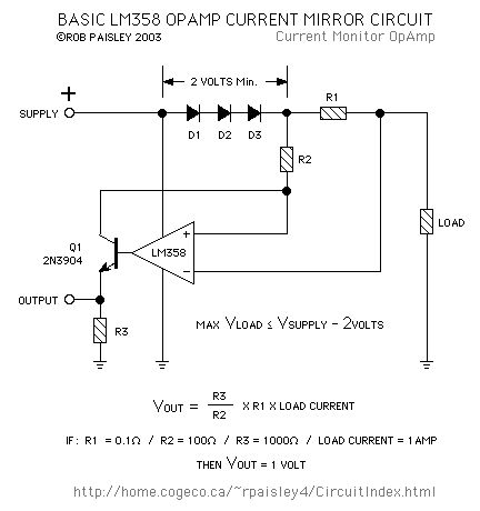The first circuit is a current monitor made with an LM358 OpAmp. While functional, the three diodes in the supply line make it unsuitable for most applications.