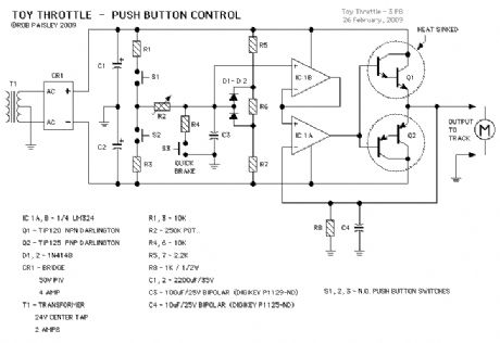 This next circuit is a variation on the Basic Toy throttle. In this version three push buttons are used to control the output.