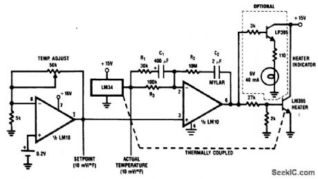 Fig. 13-11 Here, an LM10 serves as both a temperature-setting device and as a driver for the heating unit (an LM395 power transistor). The optional lamp, driven by an LP395, indicates if power is applied to the heater. When a change in temperature is desired, the user adjusts the 50-kΩ pot and the circuit makes the temperature transition with a minimum of overshoot or ringing. The circuit is calibrated by selection of R2, R3, and C2 for minimum overshoot. C2 eliminates dc offset errors. R1 and C1 are added to improve loop stability about the temperature-set point. For optimum performance, locate the temperature sensor LM34 as close as possible to the heater. This will minimize time lag between the heater and sensing. Long-term stability and repeatability are better than 0.5°F. National Semiconductor Linear Applications Handbook, 1991. p 1079 (View)