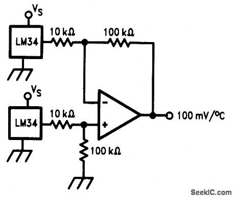 Fig. 13-12 This circuit produces an output voltage that is proportional to the temperature difference between the two LM34s. The difference amplifier sub-tracts the LM34 outputs from one another and then multiplies the difference by a factor of 10 to provide a single-ended output of 100 mV/°F of differential temperature. National Semiconductor Linear Applications Handbook 1991, p 1079. (View)
