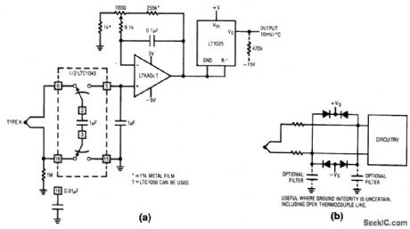 Fig. 13-15 This circuit is similar to that of Fig. 13-14, except that a type-K thermocouple subtracts from the LT1025 in series-opposed fashion. The net result is fed to the amplifier. Optional pull-down resistor R4 allows readings below 0℃. Linear Technology, Linear Applications Handbook 1990 p AN28-5. (View)