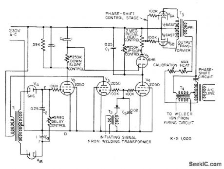Varies buildup and decay rates of, current, to increase weld quality and uniformity. Consists essentially of variable resistance inserted in phase-shift circuit of main welding control.-J. Markus and V. Zeluff, Handbook of Industrial Electronic Control Circuits, McGraw-Hill, New York, 1956, p 340. (View)