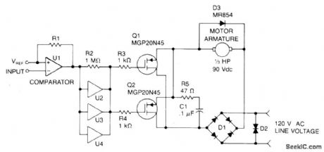Speed control is accomplished by pulse width modulating the gates of two MGP20N45 TMOS devices. Therefore, motor speed is proportional to the pulse width of the incoming digital signal, which can be generated by a microprocessor or digital logic.The incoming signal is applied to comparator U1, then to paralleled inverters U2, U3, and U4 that drive the two TMOS devices, which, in turn, control power applied to the motor armature. Bridge rectifier Dl supplies fullwave power that is filtered by R5 and C1. Free-wheeling diode D3 (MR854) prevents high voltage across Q1 and Q2.A back-to-back zener diode, D2, protects against transients and high voltage surges. (View)