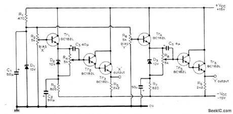 Mechanically conttolled voltage source generates two independent con-trol voltages, proportional to stick position, to serve as one of controls for elaborate sound synthesizer used for generating wide variety of musical and other sounds. Three-part article describes circuit operation and gives all other circuits used in synthesizer.-T. Ort and D. W. ThomasElectronic Sound Synthesizer, wireless world Part 3-Oct 1973.p 485-490(Part1-Aug 1973.p 366-372;Part 2-Sept.1973.p429-434) (View)