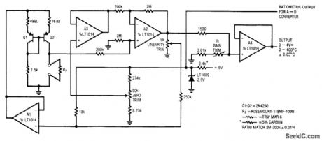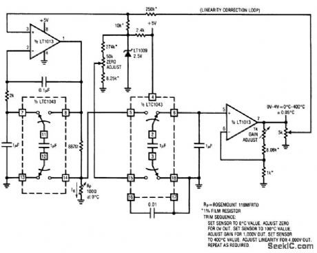 Fig. 13-19 This circuit provides complete linearized signal conditioning for a platinum RTD (Rosemount 118MFRTD). To calibrate, substitute a precision decade box (General Radio 1432k) for Rp Set the box to the 0℃ value (100.00Ω) and adjust the offset trim (50 kΩ zero adjust) for a 0.00-V output. Next, set the decade box for a 140℃ output (154.26Ω) and adjust the gain trim (1 kΩ) for a 1.400-V output reading. Finally, set the box to 249.00Ω (400.00℃) and trim the linearity adjustment (5 kΩ) for a 4.000-V output. Repeat this sequence until all three points are fixed. The total error should be ±0.05℃ over the entire range for a normal100.00-Ω (0℃) sensor. Linear Technology. Linear Applications Handbook, 1990, p AN3-6. (View)
