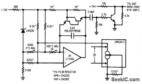 Fig. 13-24 This circuit provides a simple way to convert the current output of an LM334 temperature sensor to a corresponding output frequency. To calibrate it, place the LM334 in a 0℃environment and set the 0℃ adjustment for 0 Hz at the TTL output. Next, put the LM334 in a 100℃ environment and set the 100℃ adjust control for a 1-kHz output. Repeat this procedure until both points are fixed. This circuit has a stable 0.1℃ resolution with ±1.0℃ accuracy. Linear Technology, Linear Applications Handbook, 1990, p. AN7-2. (View)