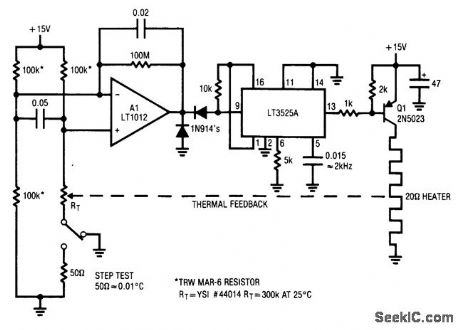 Fig. 13-34 This circuit is similar to that of Fig, 13-27, except that the sensor is a platinum RTD. If the sensor is in close thermal contact with the heater, the circuit will easily control to 0.1℃ stability over widely varying ambient temperatures. National Semiconductor, Linear Applicatrions Handbook 1991 p 858.