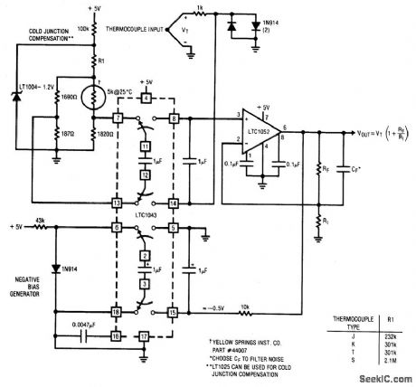 Fig. 13-31 This circuit shows a 5-V powered thermocouple signal conditioner. Cold-junction compensation is included, and the circuit allows one leg of the thermocouple to be grounded (for noise considerations). The table gives proper values for R1 for various standard thermocouples. Output scaling can be set by RF/R1 to whatever slope is desirable. Cold-junction compensation holds within ±1℃ over 0o to 60℃. Linear Technology, Linear Applications Handbook 1990, p AN 11-5. (View)