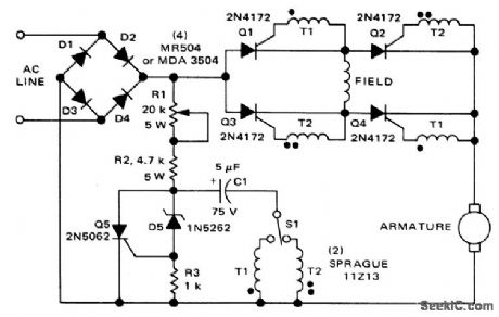 The circuit shown here can be used to control the speed and direction of rotation of a series-wound dc motor. Silicon controlled rectifiers Q1-Q4, which are connected in a bridge arrangement, are triggered in diagonal pairs. Which pair is turned on is controlled by switch St since it connects eithercoupling transformer T1 or coupling transformer T2 to a pulsing circuit. The current in the field can be reversed by selecting either SCRs Q2 and Q3 for conduction, or SCRs Q1 and Q4 for conduction. Since the armature current is always in the same direction, the field current reverses in relation to the armature current, thus reversing the direction of rotation of the motor. A pulse circuit is used to drive the SCRs through either transformer T1 or T2. The pulse required to fire the SCR is obtained from the energy stored in capacitor C1.   (View)