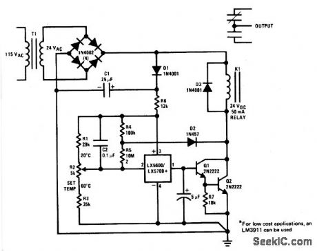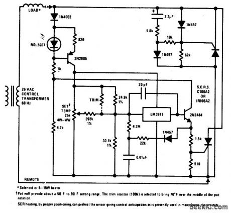 The sensor is a standard TO-5 or TO-46 package. For surface or air temperature sens-ing. Small clip-on heat sinks can be used. A simple probe can be made using heat-shrink tubing and RTV silicon rubber. Three-leads-plus-shield cable is a good choice for wire with the shield connected to pin 4. The controller can be used for baths, ovens, oven-temperature protection, or even home thermostats. Long-term stability and repeatability is better than 0.5 ℃.   (View)