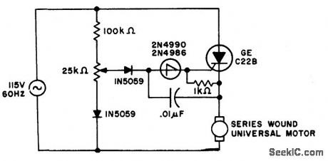 Most standard household appliances and portable hand tools can be adapted to variablespeed operation by use of this simple half-wave SCR phase control. It can be used as the speed control unit for the following typical loads providee they use series universal (brush type) motors. DrillsFansSewing Machines LathesSaber saws VibratorsPortable band saws Movie projectors Food mixers SandersFood blendersDuring the positive half cycle of the supply voltage, the arm on potentiometer R2 taps off a traction of the sine wave supply voltage and compares it with the counter emf of the motor through the gate of the SCR. When the pot voltage rises above the armature voltage, current flows through CR1 into the gate of the SCR, triggering it, and thus applying the remainder of that half cycle supply voltage to the motor. The speed at which the motor operates can be selected by R2. Stable operation is possible over approximately a 3-to-1 speed range.   (View)