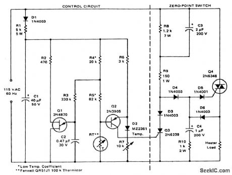 This proportional control crystal oven heater uses lead/lag compensation for fast set-ting. The time constant is changed with R4 and compensating resistor R5. If Q2 is inside the oven, a regulated supply is recommended for 0.1 ℃. control.   (View)