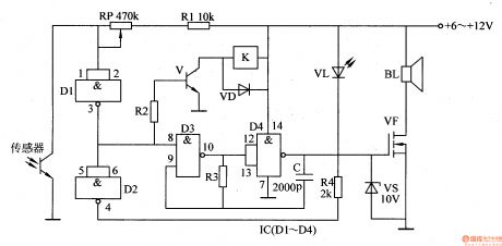 When the sensor detects nothing from outside, D1's input terminal is high level, while its output terminal is low level. D2 outputs high level, and VL is not illuminated. V is disconnected, and K is released. Audio oscillator composed of D3,D4,R3,C doesn't work and BL makes no sound.