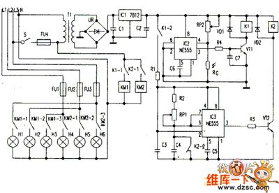 When you close the power switch S, the 220V city electricity gets to the transformer T1's primary stage through the fuse FU4, and the subprime output voltage (16V) is rectified by the rectifier bridge UR, then it gets through the regulator integrated block IC1, capacitance C1, C2's filters supply the operating power to the control circuit. IC2 and IC3 are the NE555 manifolds, the light control circuit is composed of the IC2 and the external components, the timing circuit is composed of the IC3 and the external components. The light is strong during the day time, so the photoresistor RG's resistance is small, the IC pin-24 reset terminal has the low-level voltage, transistor VT1 closes and the relay K1 cuts off, it's normally open contact points K1-1 and K1-2 cut off too, all the bulbs are not bright.