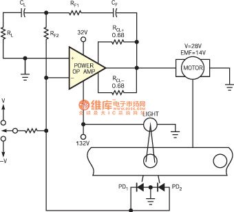 Figure 1 shows the circuit with the simple and basic design in order to achieve position control, it uses a pair of photodiodes connected in parallel with the the fast response time. Thus it achieves a system with small number of components, it has high reliability, accuracy and repeatability under clearly defined work environment. The circuit shown as the Figure 1 uses a power op amp to combine differential output of a pair of photodiodes, and it drives the direction of motor rotation to the right until the two photoelectric currents are equal, thus it achieves position control order.
