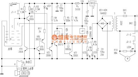 VT1, VT2, VT3, J1 are the main components of the pumping circuit, the working principle is not difficult to make a self- analysis for reader. Water protection circuit is mainly composed of the probe D and VT4, if the pumping time interval is too long, the tube memory water leakage is below D, and the water circuits A , D are open, VT4 gets saturated conduction, so that VT1 base pole clamp is at low potential. When the towers level falls to the lower limit B or less, due to the extremely low level of VT1 base, it can not be turned and therefore can not pumping.
