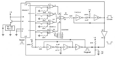 The digital lock shown below uses 4 common logic ICs to allow controlling a relay by entering a 4 digit number on a keypad. The first 4 outputs from the CD4017 decade counter (pins 3,2,4,7) are gated together with 4 digits from a keypad so that as the keys are depressed in the correct order, the counter will advance. As each correct key is pressed, a low level appears at the output of the dual NAND gate producing a high level at the output of the 8 input NAND at pin 13. The momentary high level from pin 13 activates a one shot circuit which applies an approximate 80 millisecond positive going pulse to the clock line (pin 14) of the decade counter which advances it one count on the rising edge. A second monostable, one shot circuit is used to generate an approximate 40 millisecond positive going pulse which is applied to the common point of the keypad so that the appropriate NAND gate will see two logic high levels when the correct key is pressed (one from the counter and the other from the key). The inverted clock pulse (negative going) at pin 12 of the 74C14 and the positive going keypad pulse at pin 6 are gated together using two diodes as an AND gate (shown in lower right corner). The output at the junction of the diodes will be positive in the event a wrong key is pressed and will reset the counter. When a correct key is pressed, outputs will be present from both monostable circuits (clock and keypad) causing the reset line to remain low and allowing the counter to advance. However, since the keypad pulse begins slightly before the clock, a 0.1uF capacitor is connected to the reset line to delay the reset until the inverted clock arrives. The values are not critical and various other timing schemes could be used but the clock signal should be slightly longer than the keypad pulse so that the clock signal can mask out the keypad and avoid resetting the counter in the event the clock pulse ends before the keypad pulse. The fifth output of the counter is on pin 10, so that after four correct key entries have been made, pin 10 will move to a high level and can be used to activate a relay, illuminate an LED, ect. At this point, the lock can be reset simply by pressing any key. The circuit can be extended with additional gates (one more CD4011) to accept up to a 8 digit code. The 4017 counting order is 3 2 4 7 10 1 5 6 9 11 so that the first 8 outputs are connected to the NAND gates and pin 9 would be used to drive the relay or light. The 4 additional NAND gate outputs would connect to the 4 remaining inputs of the CD4068 (pins 9,10,11,12). The circuit will operate from 3 to 12 volts on 4000 series CMOS but only 6 volts or less if 74HC parts are used. The circuit draws very little current (about 165 microamps) so it could be powered for several months on 4 AA batteries assuming only intermittent use of the relay.   (View)