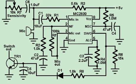 This circuit uses an MC2830 to form a voice activated switch ( VOX ). A traditional VOX circuit is unable to distinguish between voice and noise in the incoming signal. In a noisy environment, the switch is often triggered by noise, or the activation sensitivity must be turned down. This circuit overcomes this weakness. The switch is activated by voice level above the noise and not activated by background noise. This is done by utilizing the differences in voice and noise waveforms. Voice waveforms generally have a wide range of variation in amplitude, whereas noise waveforms are more stable. The sensitivity of the voice activation depends on the value of R6. The voice activation sensitivity is reduced from 3.0dB to 8.0dB above the noise if R6 changes from 14k to 7.0k . (View)