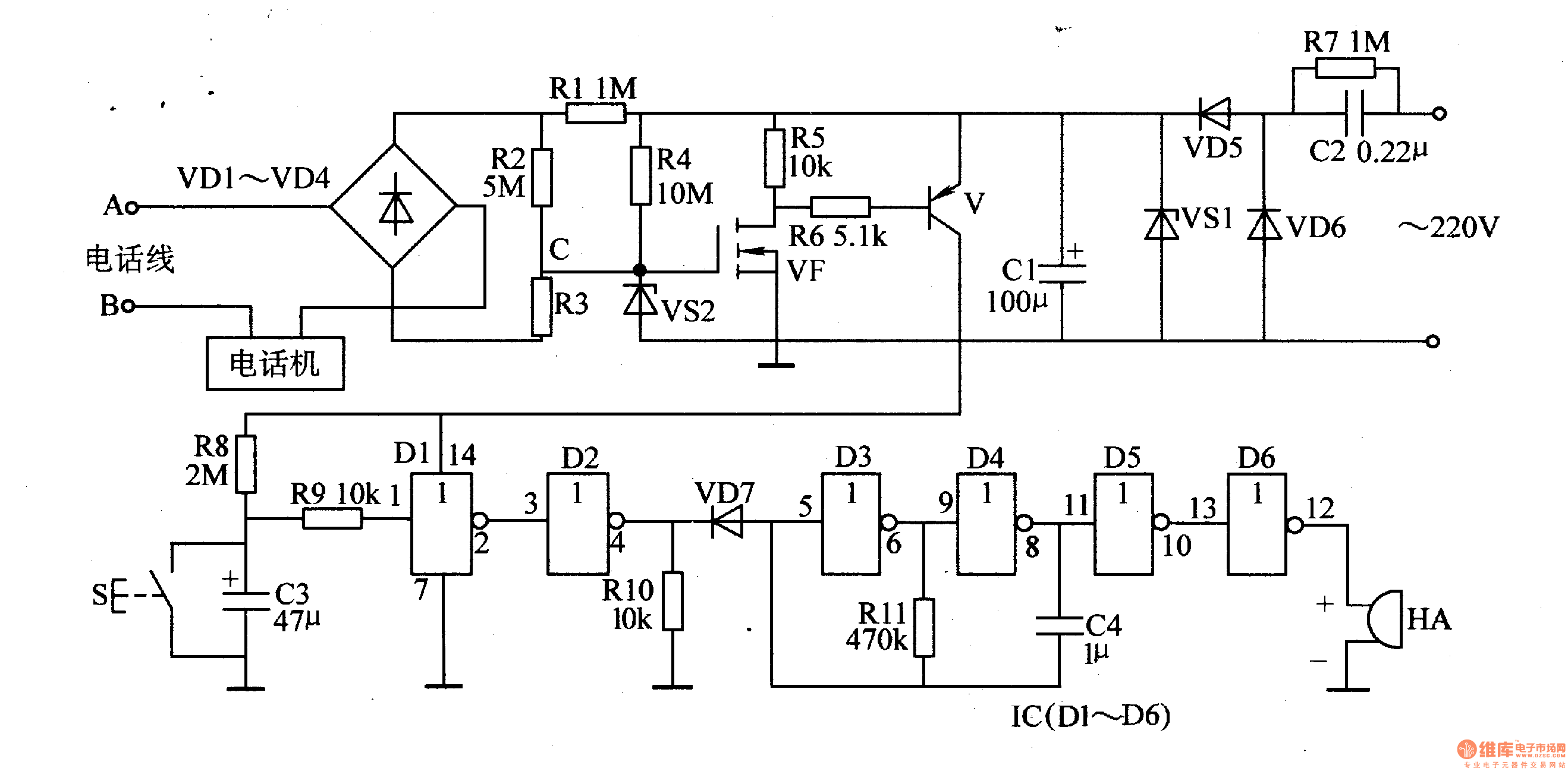 Fixed phone users may not hang up the telephone receiver well and effect the phone call after using the phone.This example describes the phone off-hook reminder,and it can not only send a sound beep to remind the user of hanging up the phone in time, but also has the role of telephone line anti-theft alarm. Principle of the circuitThis phone off-hook reminder includes supply power circuit,phone line monitoring circuit,and sound alarm circuit and so on,just as picture 6-206 shows.