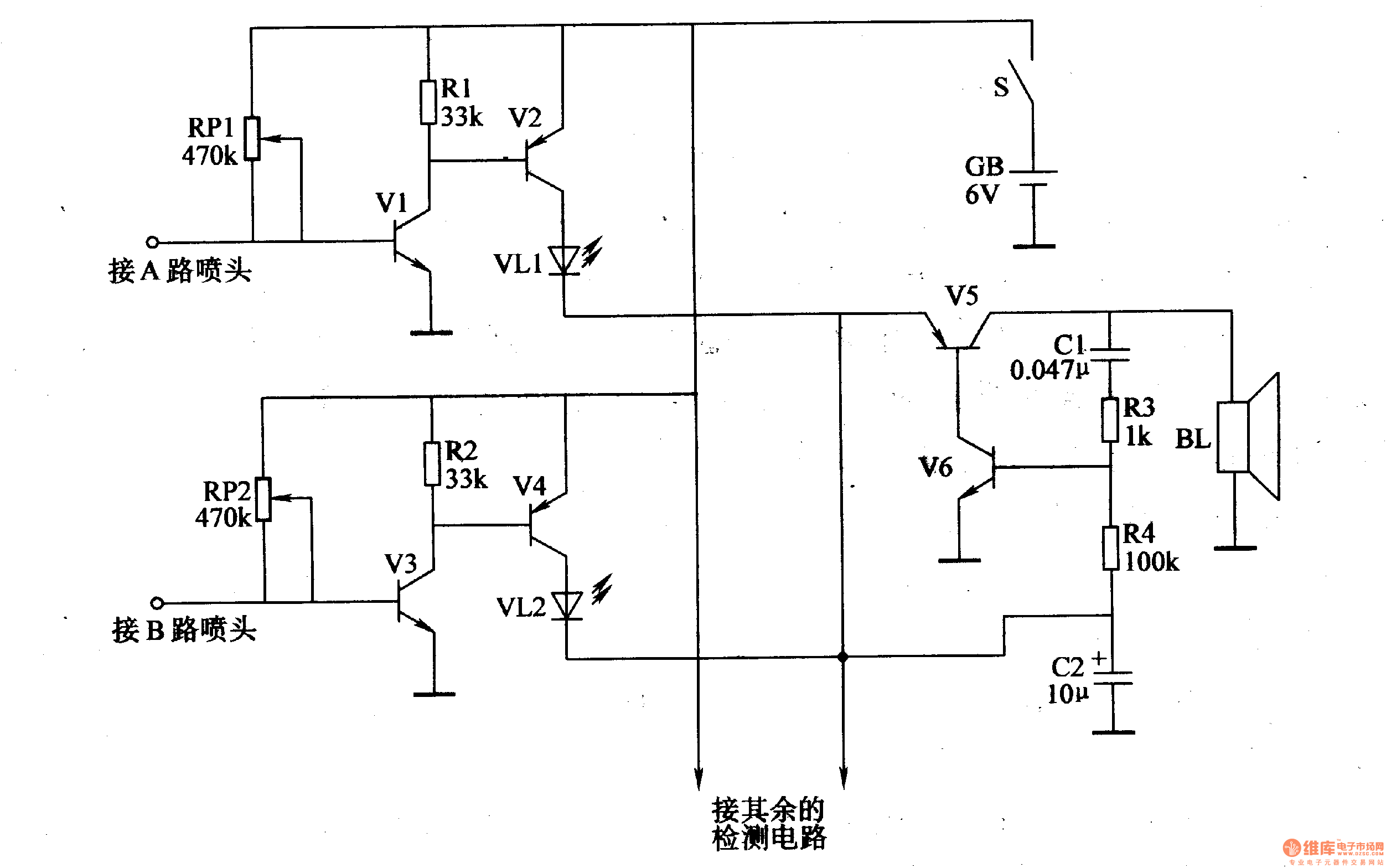 This example describes the seeder spray pipe water break alarm, which can send a sound and light alarm in time to remind workers to process timely when the water breaks. The principle of circuitThe seeder spray pipe water break alarm circuit is formed by water break detection circuit and the sound and light alarm circuit,which is shown in Figure 4-102. Water break detection circuit is formed by the transistors V1,V3,potentiometers RP1,RP2,and resistors R1,R2,etc. Sound and light alarm circuit is formed by the transistors V2,V4-V6,light-emitting diodes VL1,VL2, resistors R3,R4,capacitor C1,C2 and the speaker BL. V2,V4 and VL1,VL2 form the LED indication circuit,and V5,V6 and C1,C2,R3,R4 form the audio oscillator circuit.