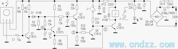 This remote control switch only uses 5 triodes, the entire circuit can be installed on the 40mm×50mm circuit board to control different electric devices on/off remotely, the circuit is shown in the figure. The remote control emitter is common household appliance remote controller. As long as the receiving control circuit is welded according to the figure, it will be success without debugging.IR is a infrared remote control receiving end, when there is no infrared signal, ① pin outputs high level, when there is a infrared signal, ① pin outputs a series of low level pulse.