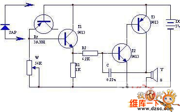 This water boiling alarm circuit is composed of four transistors, the circuit is as shown. The audio oscillator is composed of the transistor T2, T3, the resistor R2 and the capacitor C, the audio signal is output by the speaker.