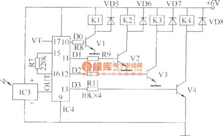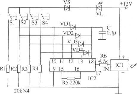Here introduces a 4-way wireless remote control switch which adopts wireless remote control transmitting/receiving and wireless remote control coding/decoding integrated circuit, and the switch can control four kinds of different appliance or control different work states of the one applianceat one time.This wireless remote control switch circuit consists of wireless remote control transmitting circuit and wireless remote control receiving circuit, as shown in the figure.The wireless remote control transmitting circuit consists of wireless remote control transmitting head IC1, wireless remote control coder and switch control circuit.