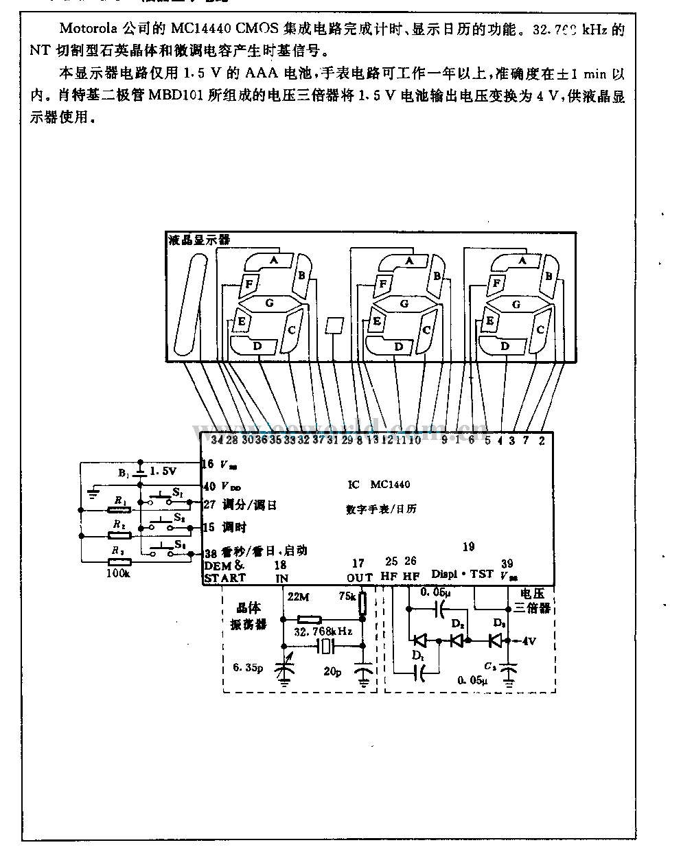 The Motorola company's MC14440 CMOS integrated circuit has the function of timing and displaying the calendar. The 32.760 kHz NT cutting type quartz crystal and fine-tune capacitance can produce time-based signal.The display circuit only uses 1.5 V AAA battery, watch circuit can workfor more than one year, the accuracyof it is within ±1min.The voltage tripler which is composed of the schottky diode MBD101, can transform the 1.5 V battery output voltage to 4V, supply to LCD using.