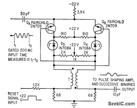 Gated 200-Mc input is fed to both emitters. Individual tenet diodes provide collector bias. Base bios is obtained from collector resistor load of opposite transistor. Potentiometer permits perfect balancing. Time intervals are measured accurately to 5 nsec.-C. S. Coffey, VHF Counter Measures Time Iptervals Precisely, Electronics, 36:34, p 27-29.