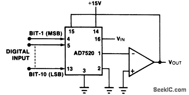 A/D dividers using the AD7520 18-pin DIP. With all bits off the amplifier saturates since division by zero isn’t defined. With the LSB (bit 10) on the gain is 1023. With all bits on the gain is 1 (courtesy Intersil, Inc.).