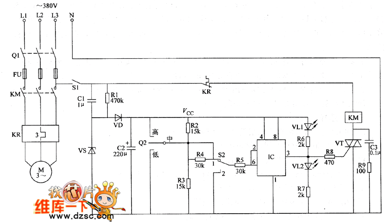 The agricultural non-tower pressurized water feeder circuit is composed of the power supply circuit and the detection control circuit, and the circuit is shown as the chart 1. Power supply circuit consists of the knife switch Q1, fuse FU, power switch S1, step-down capacitor C1, drain resistor R1, Zener diode VS, rectifier diode VD and filter capacitor C2. Detection control circuit is composed of electric contact pressure gauge Q2, resistors R2 ~ R9, capacitor C3, control switch S2, time-base integrated circuit IC, LEDs VL1, VL2, thyristor VT, AC contactor KM and thermal relay FR. R1 ~ R9 select 1/4W metal film resistors or carbon film resistors.