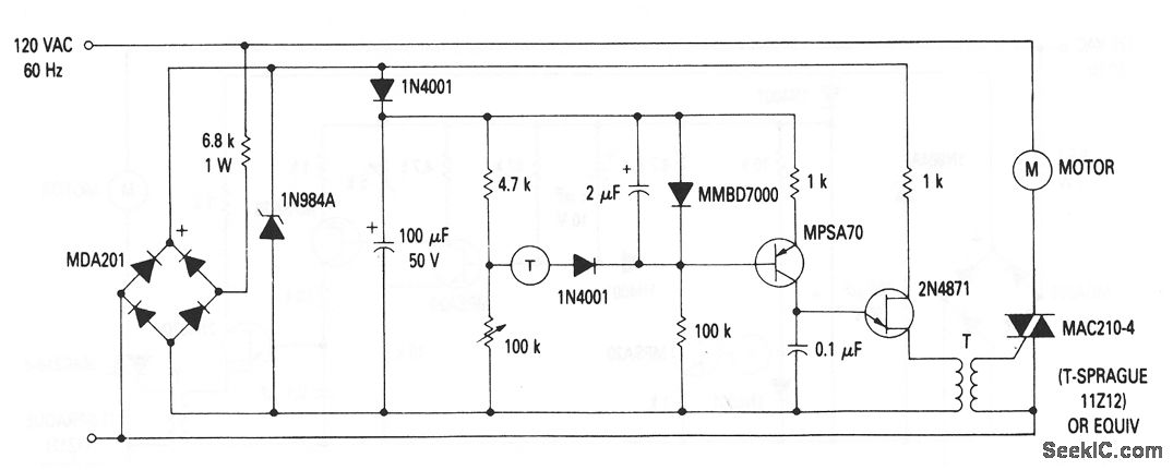 This circuit is an alternate to that shown in Fig. 8-17, but with a lower parts count. The same magnet-coil tachometer shown in Figs. 8-17B and 8-17C can be used with the circuit of Fig. 8-18. Motor speed is controlled by the 100-kΩ pot.