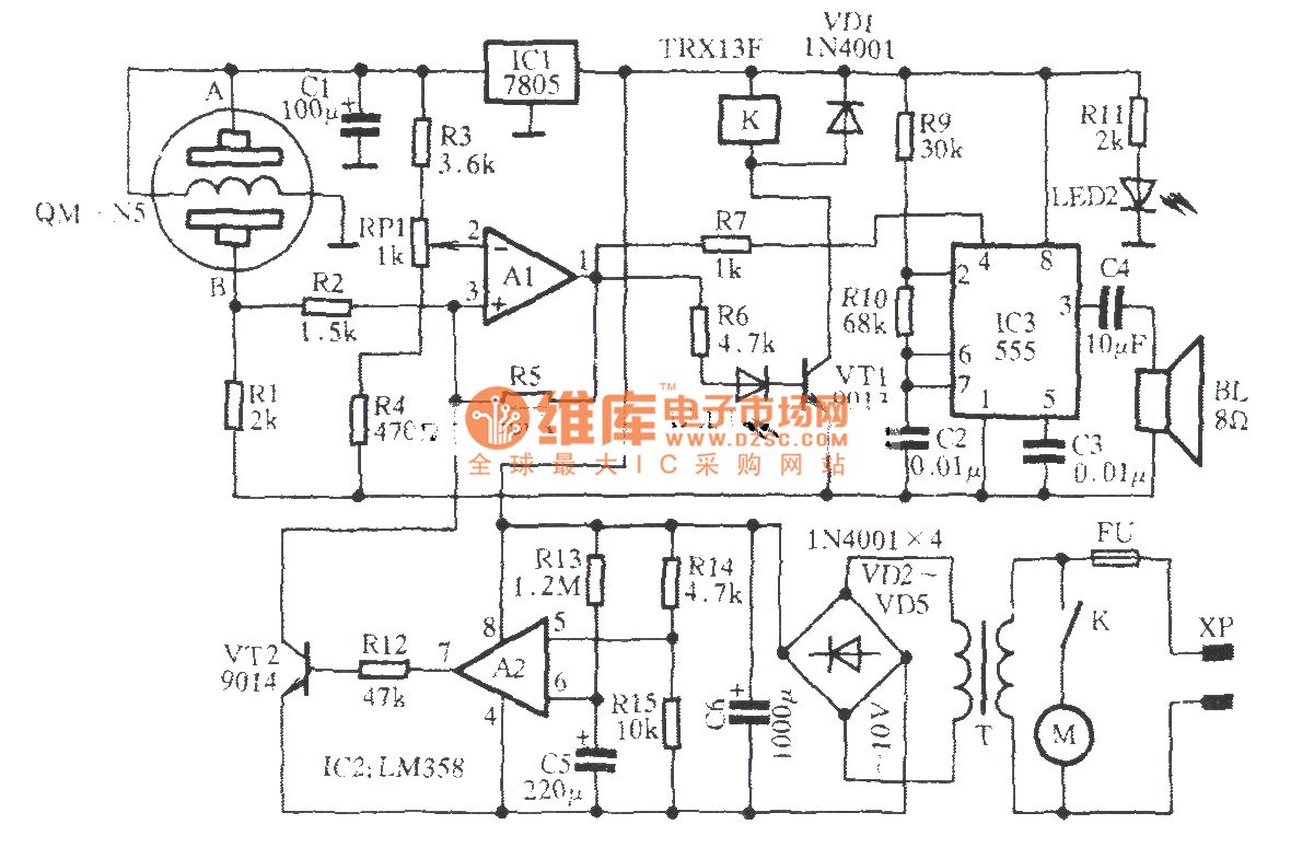 The circuit isshown in the chart, when thecooking smoke smells heavy,the hood starts automatically to emitsound and light alarm signals ; until the smoke concentration decreases , it will automatically cut off the power of hood M.