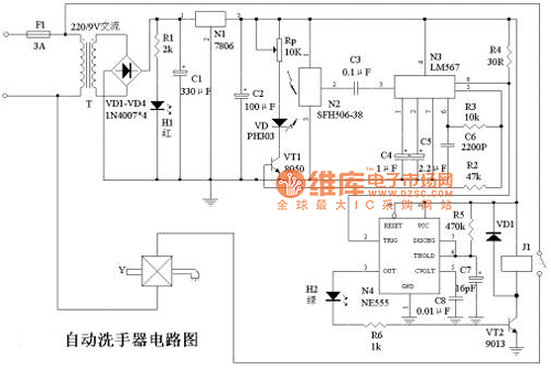 The principle of automatic washing circuit is shown in figure 1, and220VAC circuitis bucked by transformer T, and it changes to low voltage current. Then it is regulated by three terminal voltage circuit 7806 toget 6VDC to supply to control circuit. H1is a red led, which is used as a power supply instruction. N2 is theinfrared receiving circuit SFH506-38, and N3is PLL audio decoder LM567, and N3 and R3, C6form an oscillator, and R3, R6 decide the center frequency of N3's internal vco. LM567's pin 3 is the signal input,pin 8 islogic output, its output terminal is OC door output, max irrigation current is 100mA, the working voltage of LM567is 4.75 V ~ 9V. Working frequency can be from a few Hz to 500 KHZ, andthestatic working current is8mA. N4 isNE555 timer, andits peripheral componentsform the single state timing circuit, the purpose is to guarantee the normal water for washing hands when hands occasionally deviate infrared's detection range.