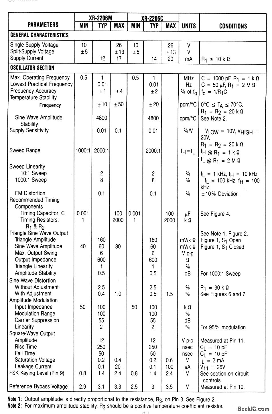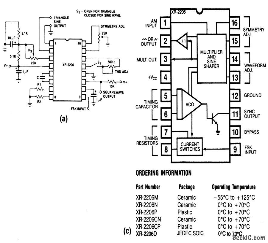 This circuit uses an XR-2206 to provide sine,square,triangle,ramp and pulse output waveforms, which can be both amplitude and frequency modulated Electrical characteristics and functional circuits of the XR-2206 are shown in Figs 5-31B and C, respectively, The operating frequency is set by capacitor C between puts 5 and 6.The THD ADJ pot between pins 13 and 14 adjusts the waveform.R3 sets the amplitude(Fig.5-31D)The SYMMETRY ADJ pot between pins 15 and 16 is a fine waveform adjustment.Open S1 for triangle, close S1 for sine.The square output is at pin 11 .See Conditions in Fig. 5-31B
