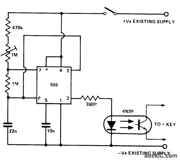 This circuit can be fitted to any calculator existing with an automatic constant to enable it to be used as a stop-watch. The 555 timer is set to run at a suitable frequency and connected to the existing calculator battery via the push-on push-off switch and the existing calculator on-off switch.