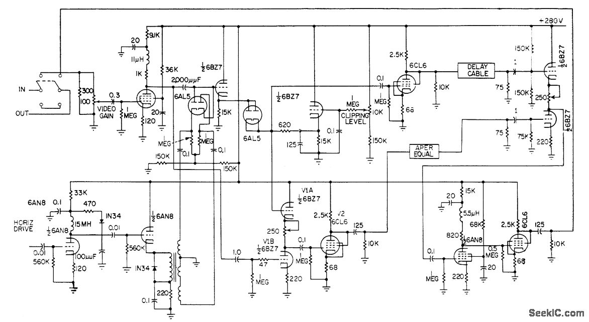 Provides better signal-to-signal noise ratio and improved definition over conventional aperture equalizers covering full brightness range. Since most image orthicon noise is in low light region, improvement is achieved by dividing signal into two parts and equalizing only relatively quiet highlight portion. Complete video signal is amplified and applied to white clipper and to difference amplifier V1-V2. Horizontal drive is also applied to clamp portion of circuit. Video signal is clamped at white clipper, where high-lights are clipped from signal-M. V. Sullivan, Highlight Equalizer Sharpens Tv Pictures, Electronics, 31:3, p 72-74.
