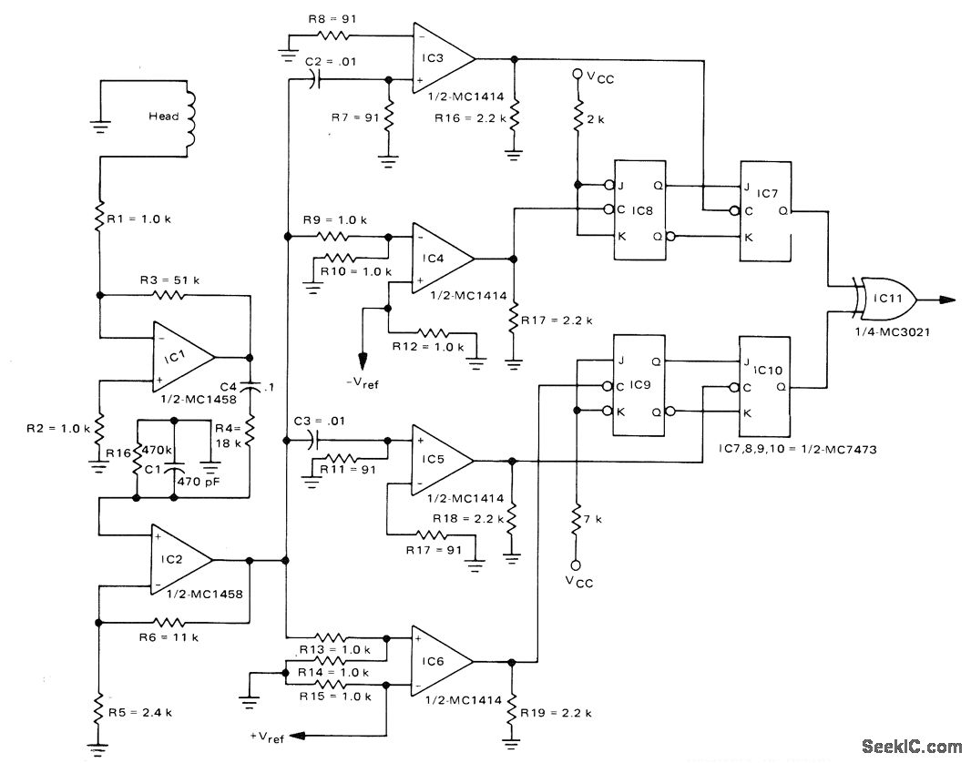 Uses separate circuits haying threshold provisions for both positive and negative peaks, for reading data stored on cassette tape at 15 in/s. Head output signal is 10 mV. Phase encoding is used with 1600 flux reversals per inch. Circuit design procedure is given. Two Motorola MC1458 gain stages feed head output to passive differentiators C2-R7 and C3-R11 to generate zero crossing. Corner frequency for each differentiator is 86 kHz. IC3 and IC4 process negative-going peaks, while IC5 and IC6 process positive-going peaks. Outputs of IC4 and IC6 drive T flip-flops serving as data inputs to IC7 and IC10.- The Recovery of Recorded Digital Information in Drum, Disk and Tape Systems, Motorola, Phoenix, AZ, 1974, AN-711, p 9.