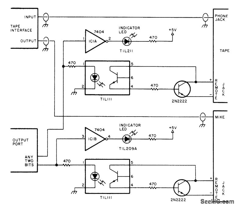 Interface circuit controls two tape decks for updating mailing lists or other sequential files stored on magnetic tape in audio cassettes. Two cassette tape recorders are required, one for input (reading files) and one for output (writing files). Micro-processor tape input and output circuits are connected to appropriate tape unit as shown. Only one cassette operates at any given time. Optocouplers prevent polarity or voltage problems between tape motor and microprocessor. Tape functions are under software control. Soft-ware delay of about is allows tape motor to come up to speed before recording starts. Records are in numerical or other logical sequence, so updating requires only one pass. On update, old cassette file is read into microprocessor for deletion, change, or addition of data, and corrected data is written on new cassette. Article covers use for maintaining Christmas card and other mailing lists, payroll records sequenced by Social Security number, and other sequential lists.-W. D. Smith, Fundamentals of Sequential File Processing, BYTE, Oct. 1977, p 114-116, 118, 120, 122, 124, and 126-127.