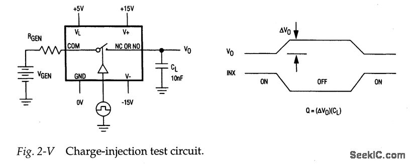 Figure 2-V shows a test circuit for measuring charge injection for the MAX301/ 3/5. Notice that charge injection (Q) is measured in coulombs (C). A pulse is applied to the control pin and the difference in output voltage is noted. Q is calculated when the difference in output voltage is divided by the capacitance at the output. Typical charge injection is 10 to 15pC.