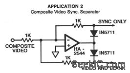This circuit uses an HA-2544 video op amp (Fig. 3-29) to separate the TV sync signal from the video and blanking signal with a minimum of external components.