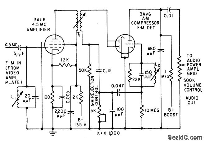 Costs less than ratio derector sound system. Uses discriminator circuit with triode operating us power detector, with cancellation of undesired aim fundamental.-R. B. Dome, Inexpensive Sound for Television Receivers, Electronics, 32:9, p 66-68.