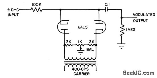Tube serves in place of chopper. Carrier voltage turns diodes on and off, transferring d-c input signal to output when diodes are not conducting. With 10-v rms carrier voltage, output is linear up to 2 v for inputs up to 5 v d-c.-L. S. Klivans, Modulators for Automatic Control Systems, Electronics, 31:1, p 82-84.