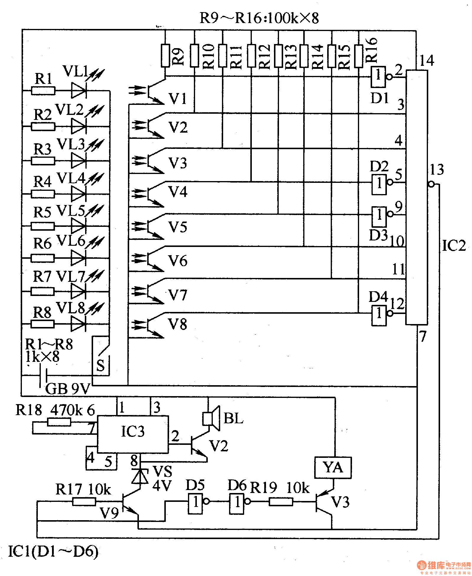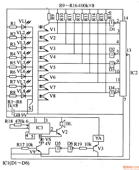 The digital lock circuit consists of the optical switch circuit, trigger, sound and alarm circuit and solenoid drive circuit, and it is shown in Figure 3-100. Photoelectric switch circuit consists of the light-emitting diodes VLl-VL8, phototransistors Vl-V8 and resistors Rl-R16. Trigger circuit consists of the Dl-D4 which are inside of six NOT gate integrated circuit ICl (Dl-D6) and eight-input NAND gate IC lC2. Sound and alarm circuit is composed of the integrated circuit IC3, transistors V9, VlO, voltage regulator diode VS, speaker BL and resistors R17, Rl8.