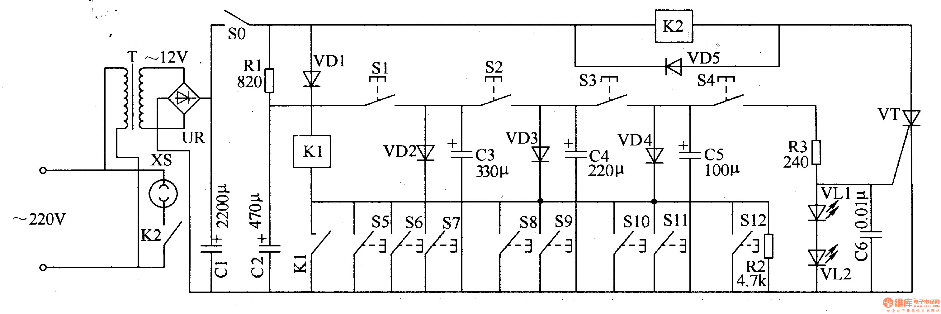 The digital lock circuit is composed of the power switch SO, power transformer T, bridge rectifier UR, relays Kl, K2, password buttons Sl-Sl2, transistors VT, LED VLl, VL2, diodes VD1-VD4, resistors R1 -R3 and capacitors Cl-C6, and it is shown in Figure 3-103. Rl-R3 use the 1/4W carbon film resistors or metal film resistors. Cl-C4 select ultra small aluminum electrolytic capacitors with the voltage in 16V; C5 uses the monolithic capacitor. VD1-VD4 are choose 1N4148 silicon switch diode; VD5 uses the lN4007 silicon rectifier diode.